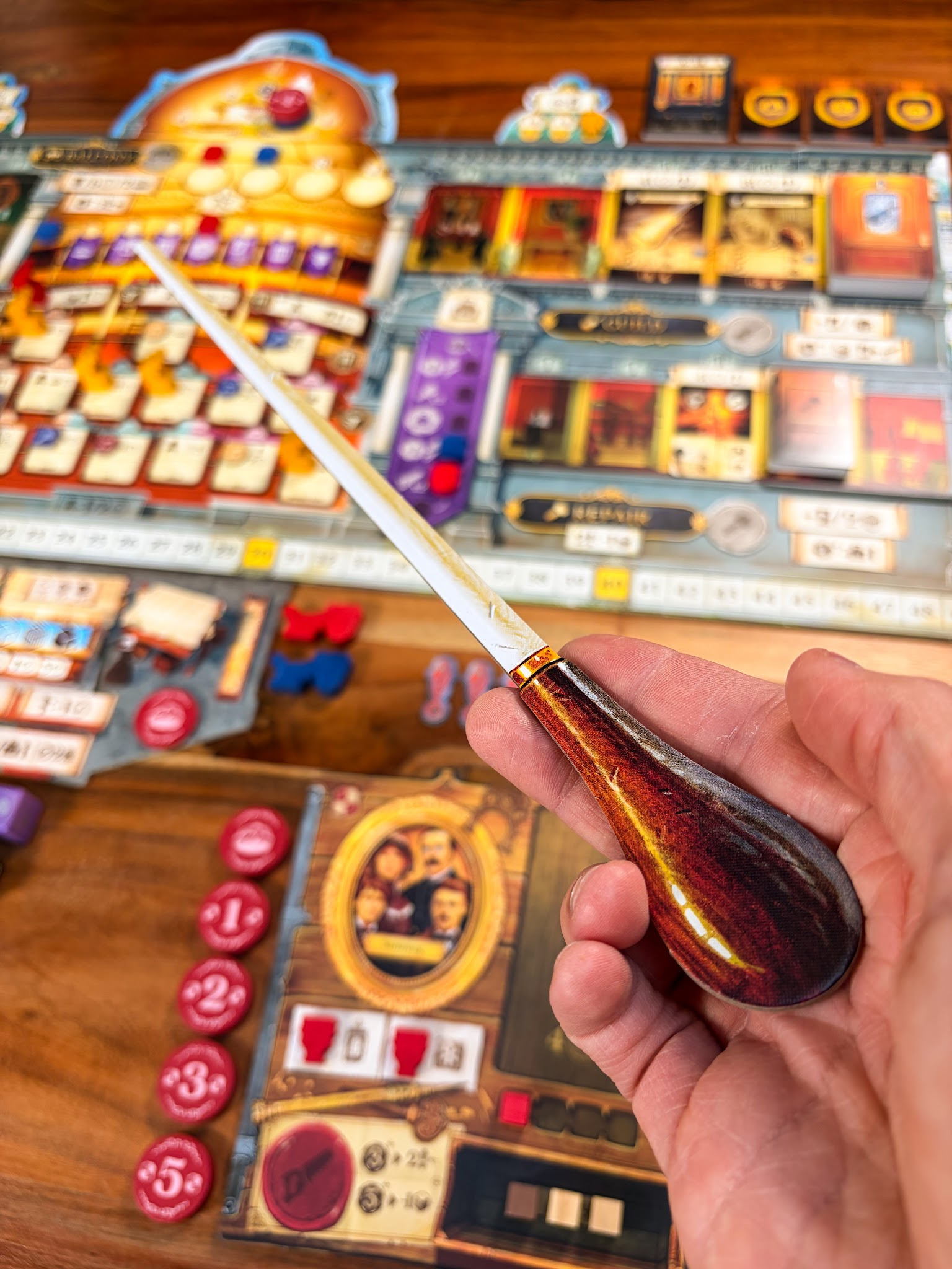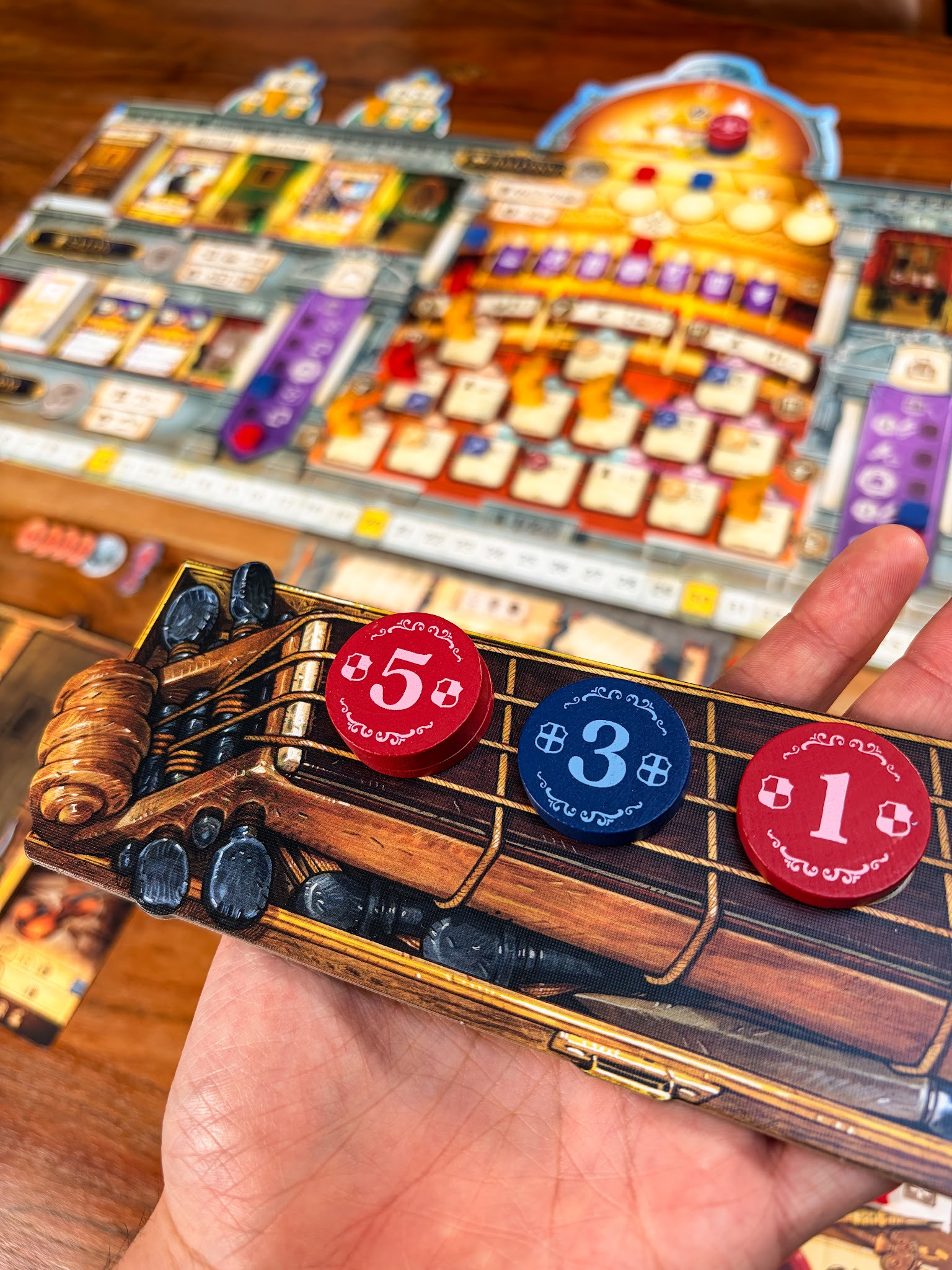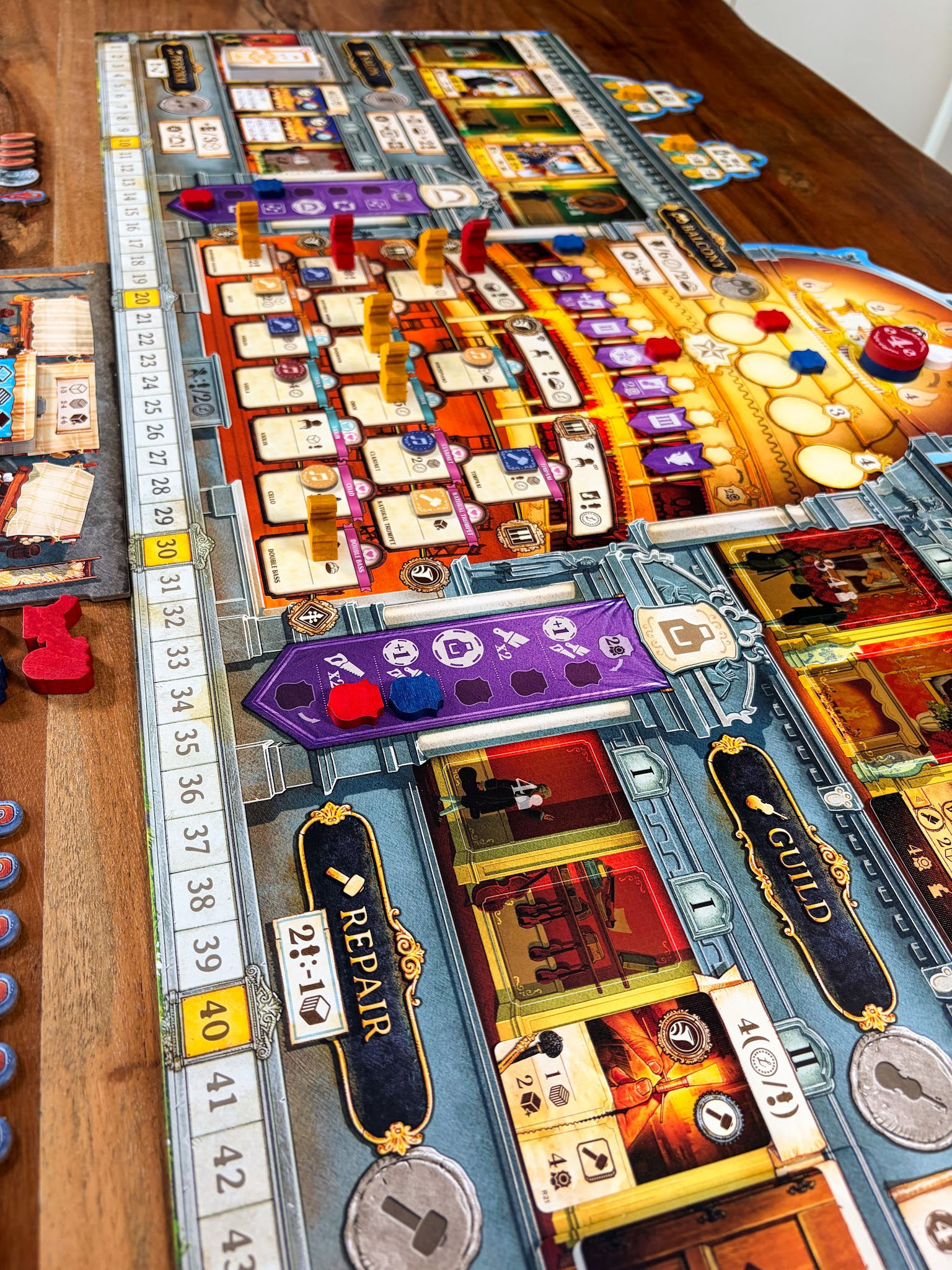 In de kern is Luthier een worker placement spel met een interessante twist. Je kiest niet alleen waar je je werkers plaatst, maar ook met welke waarde. Die waarde bepaalt de volgorde waarin acties worden uitgevoerd. Dat zorgt voor spanning, omdat niet alles elke ronde beschikbaar is. Soms zit het tegen, maar juist dat maakt je keuzes belangrijker.