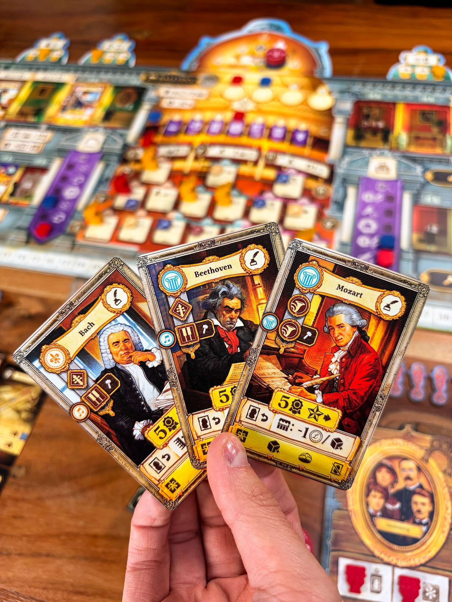 Het thema en de vormgeving brengen het spel echt tot leven. Door het spel heen kom je historische figuren tegen zoals Francesca Caccini, Mozart, Leopold II en Queen Victoria, wat zorgt voor extra sfeer aan tafel. De kwaliteit van het materiaal is hoog. Mooie kaarten, houten onderdelen en zelfs een kartonnen dirigeerstokje dat verrassend handig blijkt tijdens het uitleggen van het spel.