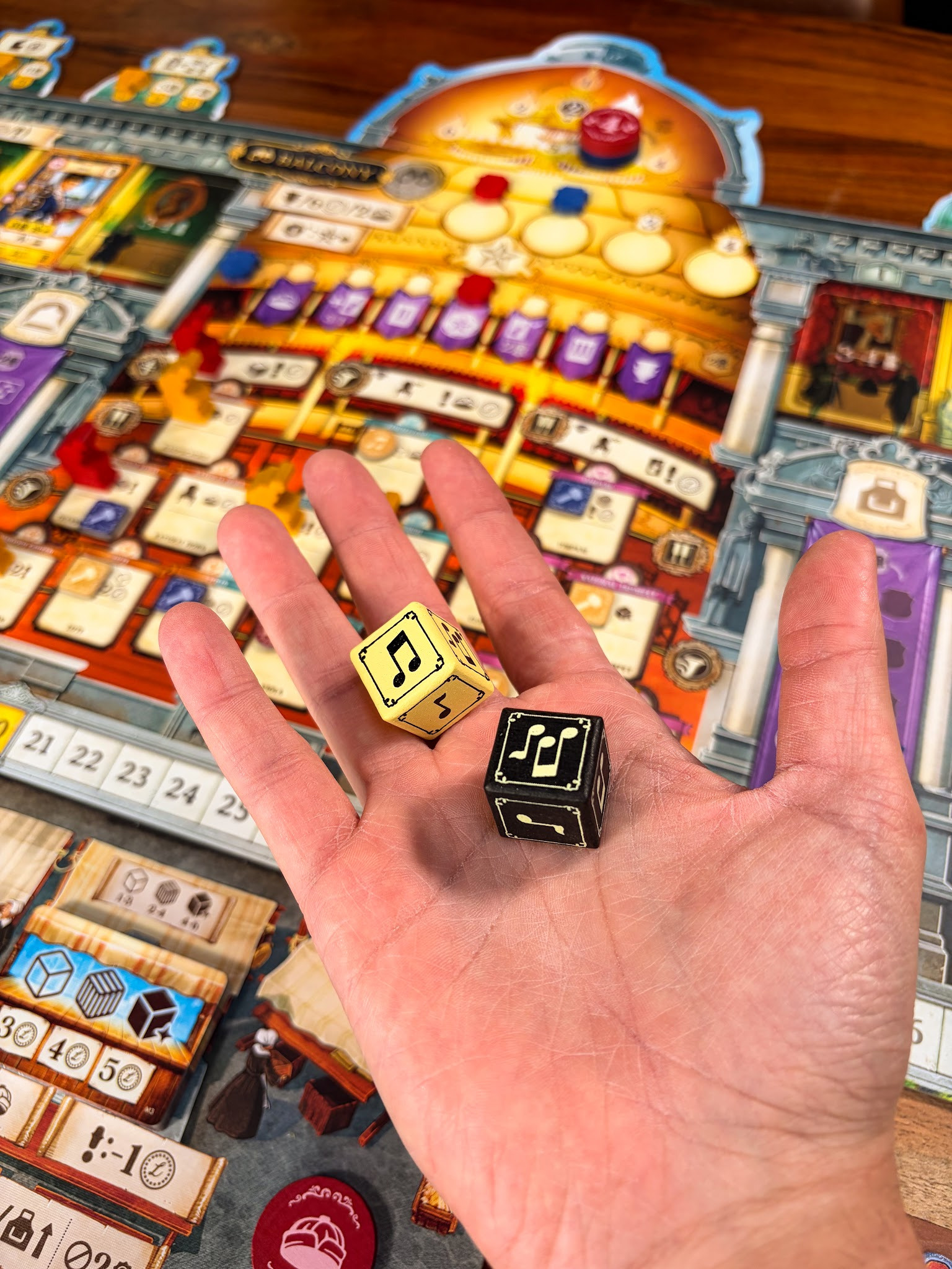 De verschillende locaties en voortgangssporen geven je de ruimte om je eigen strategie te kiezen. Je kunt verschillende richtingen op, afhankelijk van wat je wilt bereiken. De optreedlocaties voegen daar nog een extra laag aan toe, doordat je met dobbelstenen moet voldoen aan bepaalde eisen. Er zit dus een beetje geluk in, maar je hebt genoeg manieren om dit te sturen en een sterke strategie rondom optredens op te bouwen.