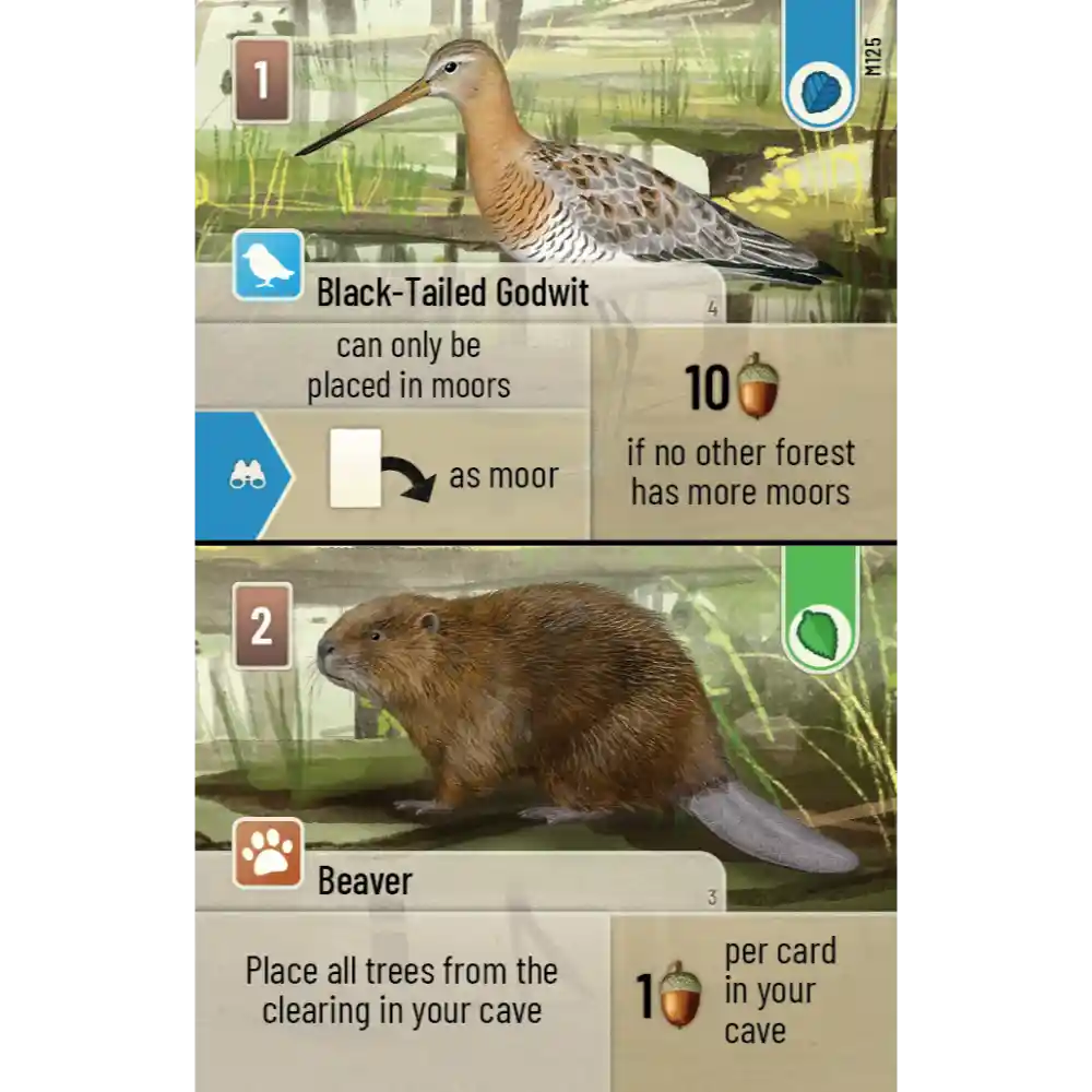 De grootste vernieuwing zijn de terreinkaarten – open vlaktes, moerassen en bronnen – die horizontaal worden gespeeld en bepalen waar dieren zich thuis voelen. Herten mijden het veen, vogels zoeken water, en elk stukje landschap vraagt om zorgvuldige planning. Ook de asymmetrische startgrotten en aangepaste boomsymbolen zorgen voor frisse strategieën. Met 180 prachtig geïllustreerde kaarten blijft Dartmoor trouw aan het originele spel, maar voelt elke sessie als een nieuwe wandeling door de wilde natuur.