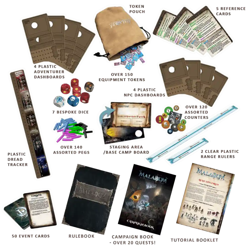 De doos zit boordevol materiaal dat uitnodigt om direct te spelen. Gedetailleerde miniaturen, modulair 3D-terrein, stevige dashboards en luxe spelelementen zorgen ervoor dat elke speelsessie aanvoelt als een echte expeditie. Of je nu houdt van tactisch plannen, verhalend spel of het samen beleven van een lange campagne: Maladum biedt een fantasiewereld waarin je steeds opnieuw wilt afdalen.