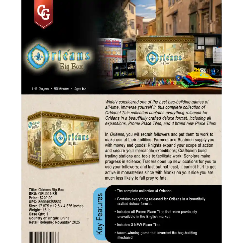 In Orléans: Big Box vind je het complete Orléans-universum in één pakket. Alle uitbreidingen, modules en extra tegels tot 2025 zijn inbegrepen, klaar voor eindeloze strategieën in middeleeuws Frankrijk.