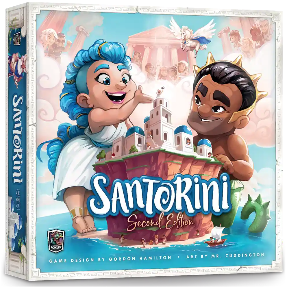 Santorini 2nd Edition is een vernieuwde uitgave van het populaire abstracte strategiespel. In deze versie speel je met 32 godenkaarten en 4 moduskaarten. Elke speler bouwt aan een driedimensionale stad op het eiland Santorini en probeert als eerste een toren van drie verdiepingen te beklimmen.