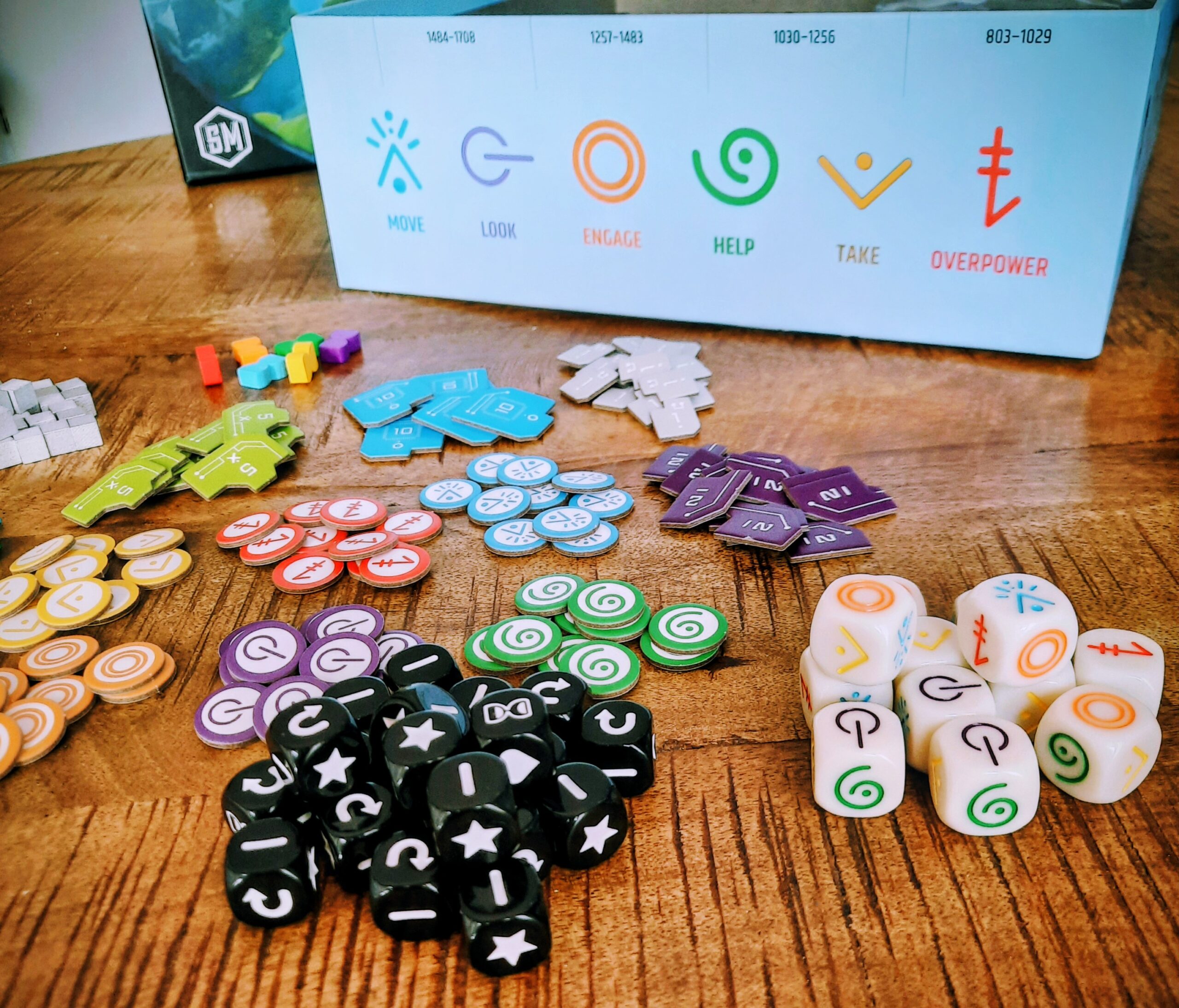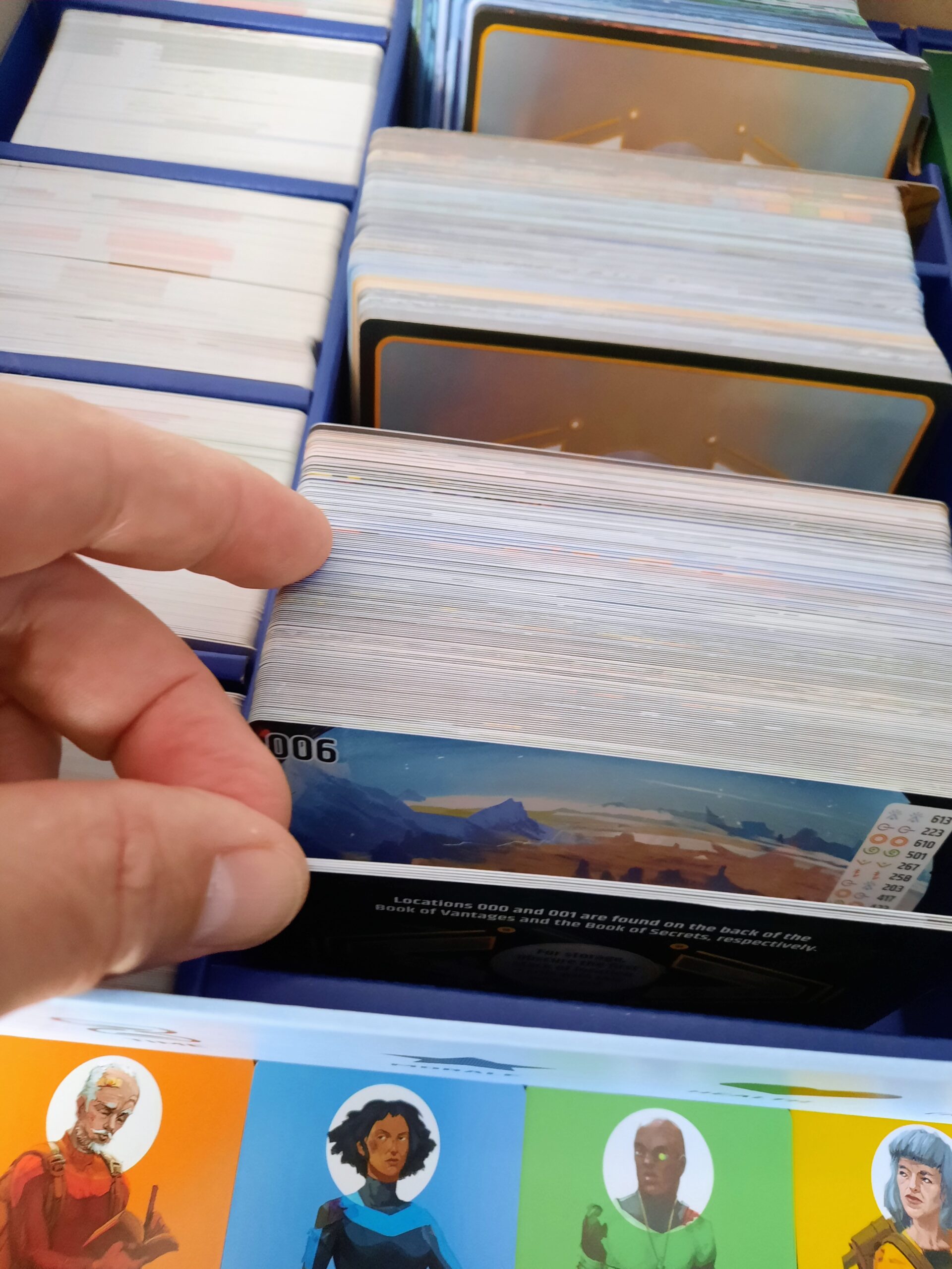 Laat ik afsluiten met te zeggen dat Stonemaier Games met Vantage een werkelijk uitzonderlijke speelervaring aan spelfanaten biedt. Het geheel omvat een fascinerende reeks verkenningsavonturen, die solo of samen met anderen gespeeld kunnen worden. De enorme hoeveelheid inhoud in de loodzware doos is verbijsterend (meer dan 400 grote dubbelzijdige locatiekaarten, meer dan 900 kleinere kaarten, 7 verhalenboeken, een Book of Secrets en een Book of Vantages). De productiekwaliteit van de onderdelen (dobbelstenen, fiches, blokjes, enzovoort) is van topklasse. De tactiele ervaring van het gooien met een handvol hoogwaardige dobbelstenen (vooral de zwarte!) is bijzonder prettig te noemen. Persoonlijk vind ik niet elk aspect van de illustraties even mooi (met name de manier waarop de bemanningsleden zijn afgebeeld en de hoekigheid van de Sentients), maar de prachtige planetaire landschappen zijn intrigerend, kleurrijk en versterken ten zeerste de sfeer.
