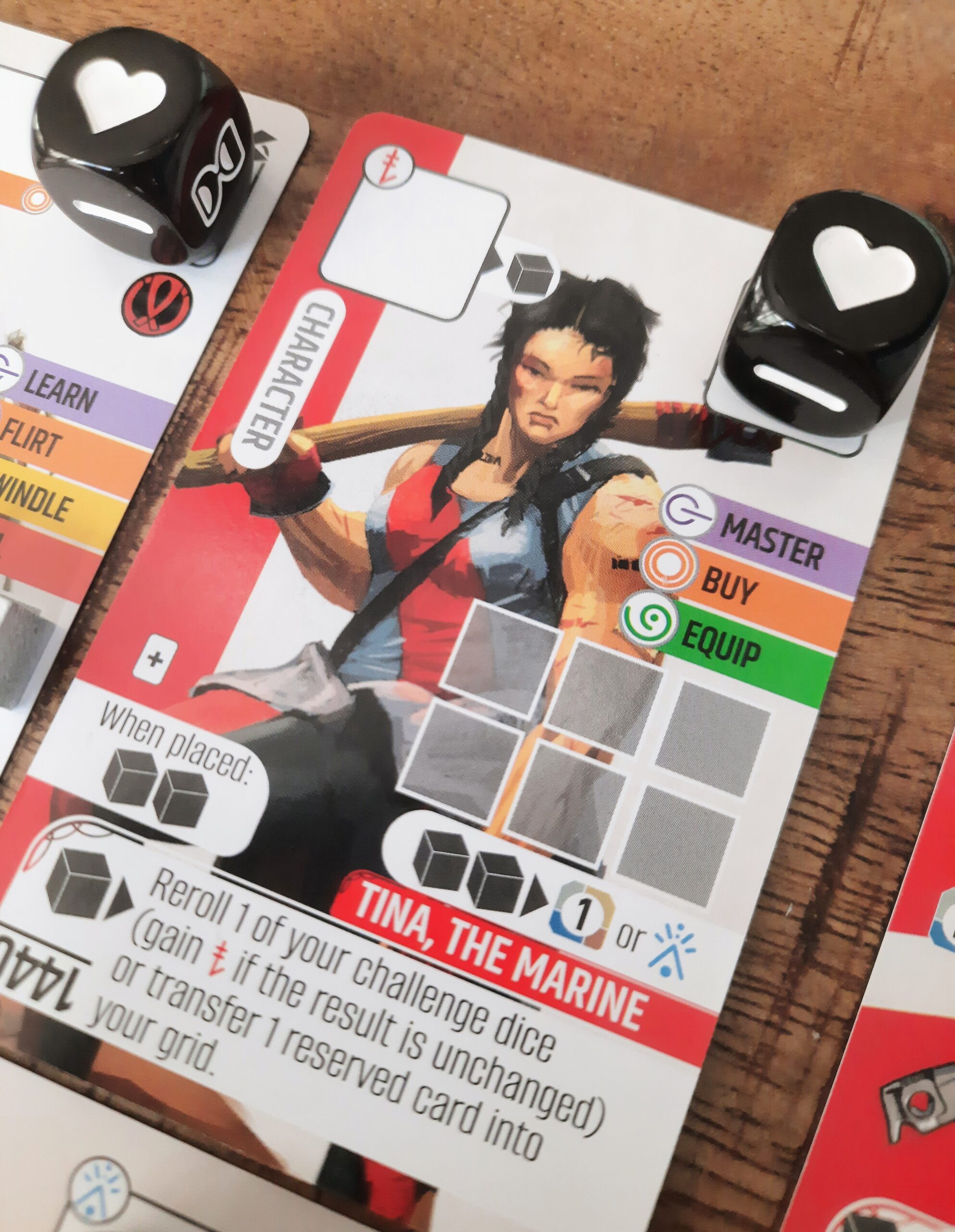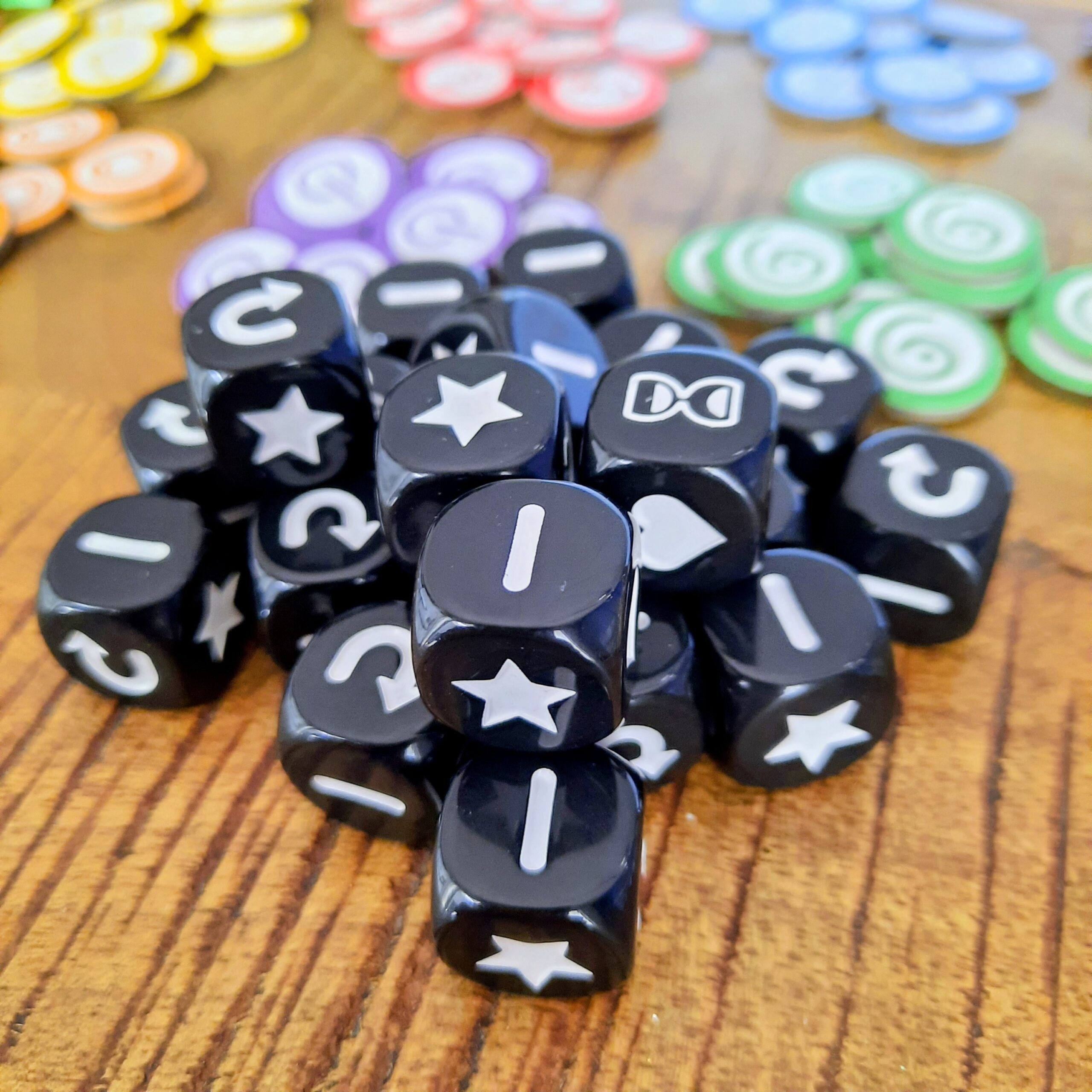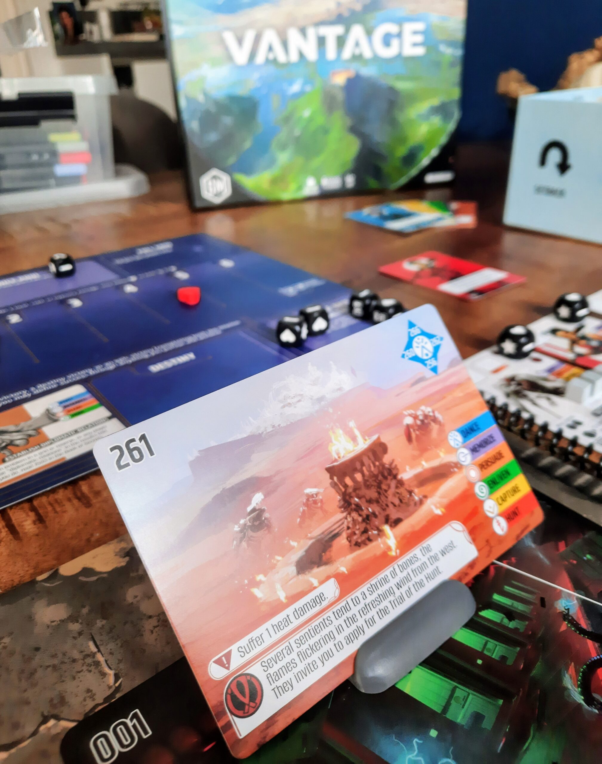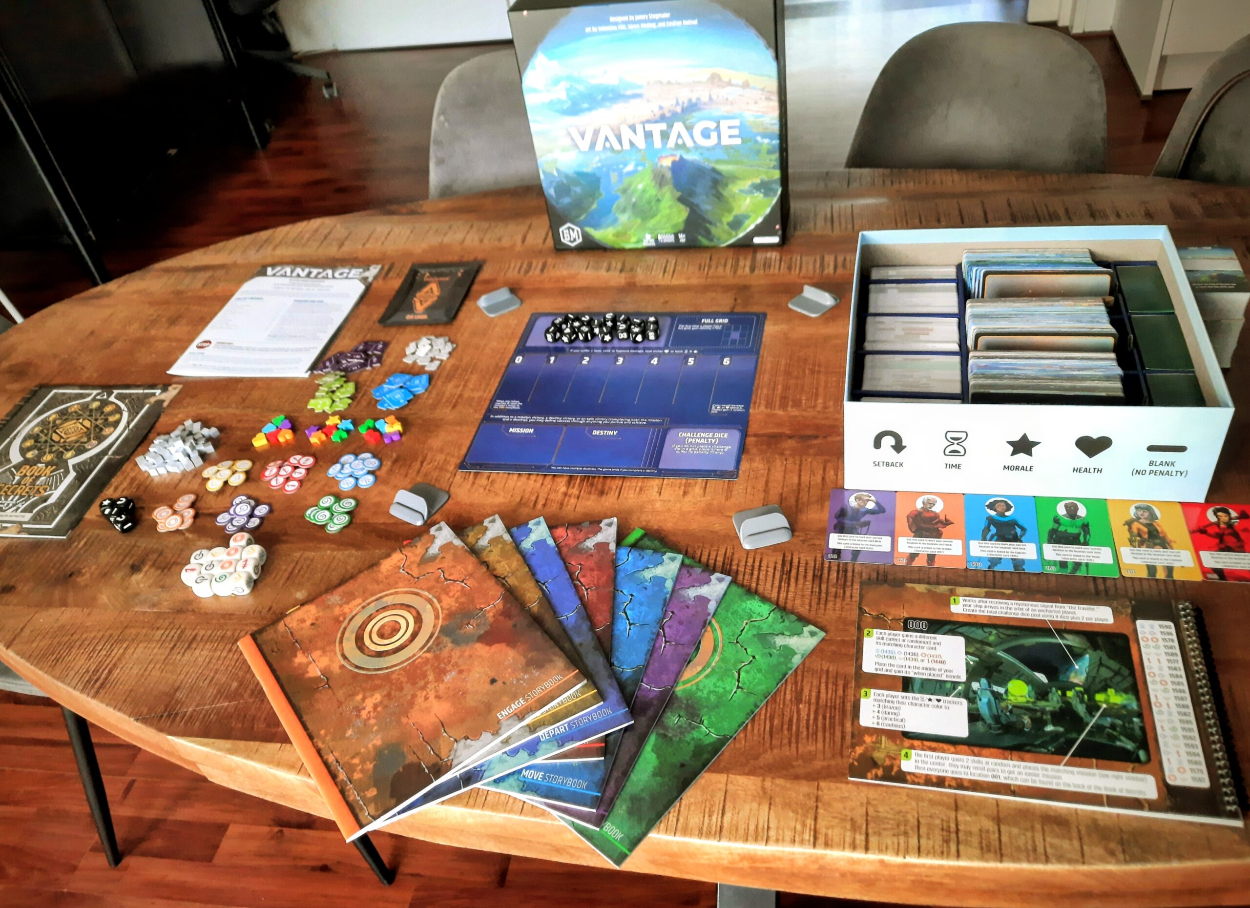 Een ander uniek aspect van Vantage, in vergelijking met andere spellen in het CYOA-genre, is het feit dat je acties in principe altijd succesvol zijn. Maar let wel: ze hebben nog steeds een prijs. Keer op keer worden je vaardigheidsniveaus op de proef gesteld, omdat er voortdurend uitdagingen zijn die moeten worden overwonnen. Daarom moet je, om iets te kunnen ondernemen, een bepaald aantal zwarte uitdagingsdobbelstenen gooien, omdat een actie onvermijdelijk invloed heeft op je Gezondheid of Moreel, of simpelweg Tijd kost. Je kunt je eigen verworven kennis en vaardigheden (in het spel weergegeven door gekleurde fiches met symbolen) en/of die van je medespelers gebruiken om de uitdagingskosten te verlagen (d.w.z. het aantal uitdagingsdobbelstenen dat moet worden gegooid te verminderen) of om Hartjes, Sterren of Zandlopers die zijn gegooid te elimineren door dobbelstenen op de kaarten te plaatsen die je tijdens je verkenningen en avonturen hebt verzameld. Beschermende uitrusting of wapens kunnen bijvoorbeeld een klap opvangen (dus je kunt dan een dobbelsteen met een Hartsymbool op zo’n kaart leggen). Zorg ervoor dat je fit blijft, je moreel hoog houdt en niet te veel tijd verspilt … anders kan het spel subiet eindigen (en moet je helemaal van voren af aan beginnen).