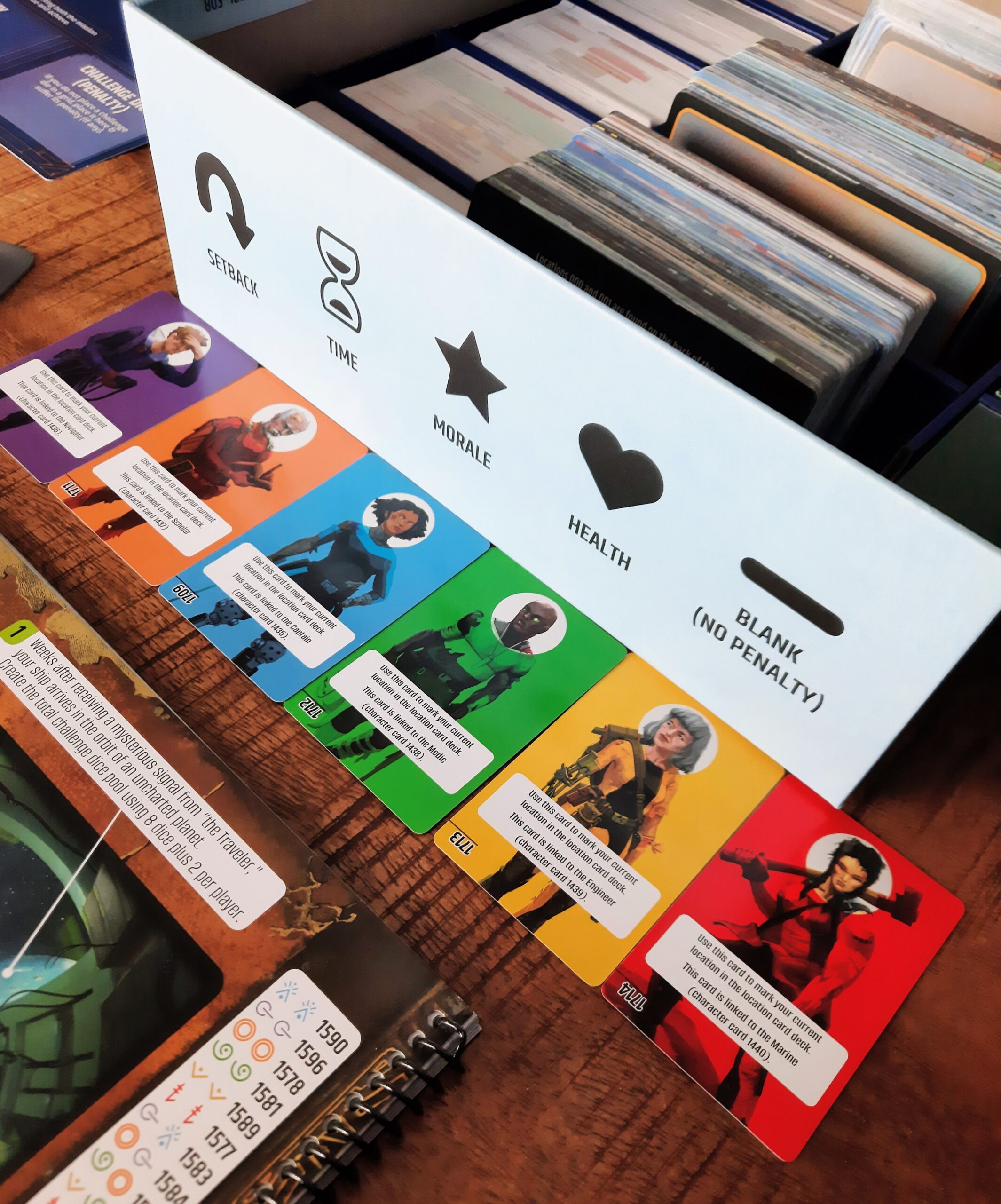 Ik vind dat dobbelsteenplaatsingsmechanisme in Vantage trouwens erg leuk. Het is thematisch gezien volkomen logisch, hoewel sommige symbolen en terminologie op het eerste gezicht misschien een beetje verwarrend kunnen overkomen. Zoals beschreven, verlies je een beetje Gezondheid, Moreel of Tijd, maar verrassend vaak vallen de uitkomsten van een worp alleszins mee; dat wil zeggen, wanneer je de zogeheten Blanks gooit (die worden weergegeven als mintekens op de dobbelstenen, maar eigenlijk heel positief zijn, omdat ze je niet een of meerdere stapjes terug laten zetten op een van de drie essentiële sporen) en/of als je Setbacks gooit. Dat laatste zou je kunnen vertalen als ’tegenslagen’, maar dat zijn het juist vaak niet, aangezien de geworpen Pijlsymbooltjes betekenen dat je de betreffende dobbelstenen terug mag leggen in de voorraad. Het gevolg is overigens wel dat het wat langer duurt voordat je de complete voorraad van Uitdagingsdobbelstenen opnieuw mag verversen, maar over het algemeen gesproken gooi ik vele malen liever Pijltjes dan Hartjes, Sterren of Zandlopers.